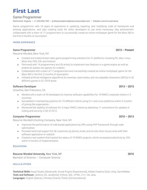 These 3 resumes got real people hired as game developers. If you apply these lessons to your own game developer resume or cv, you could get. Get more job offers & pick up more ideas for your new resume with our free, highly instructive game programmer resume example. Writing a game developer resume can be a challenge, but with the right guidance, you can create a compelling document that will help you.